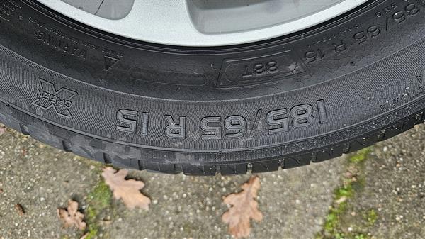 Set van 4 stuks Michelin banden type Engery Saver 185 x 65 R 15 op originele Peugeot 208 Azote 4 x 108 lichtmetalen velgen. Eén velg heeft stoeprand schade (zie detail-foto's). Banden hebben profiel van 3-4 mm.